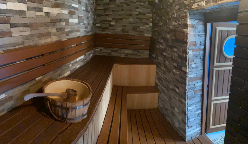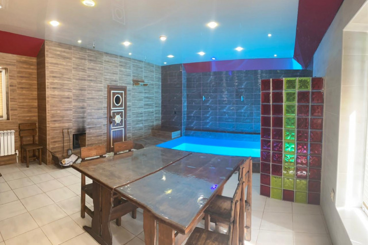 Зал рассчитан на 4-10 отдыхающих. В сауне имеется банкетная комната оборудованная комфортной мебелью , мини кухней , караоке для приятного отдыха. В сауне находится парная на дровах, температуру в которой определяете самостоятельно добавляя дрова в печь. После парной можно окунуться в бассейн с теплой водой глубиной 2 метра. Так же вы можете отдохнуть в комнате отдыха на ортопедическом матрасе или на летней площадке , где можно позагорать и приготовить блюда на кирпичном мангале и русской печи.